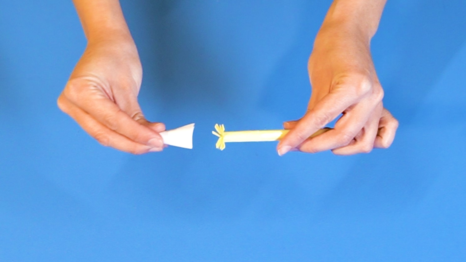 Tape or glue-stick the cone to the “teeth” on the bottom of the tube.