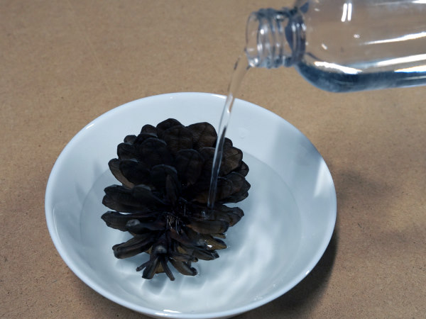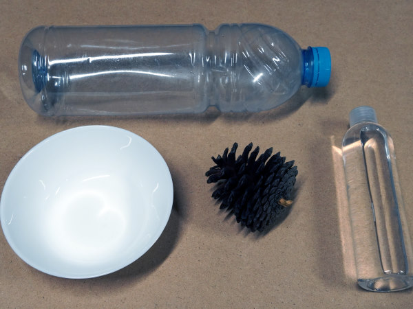 If you can’t find a bottle with a wide enough mouth or a pinecone small and narrow enough to fit through the bottle, perform only the first part of the experiment – soak the pinecone in water and wait for it to close. After it closes, dry it in a microwave. After a few minutes, it will reopen! Important note: do not put the plastic bottle in the microwave!
