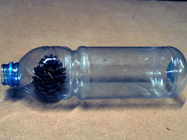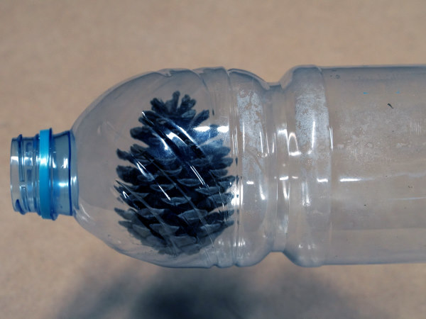 Insert the closed pinecone into the bottle. If the pinecone doesn’t fit through, use a bottle with a wider mouth or a smaller pinecone.